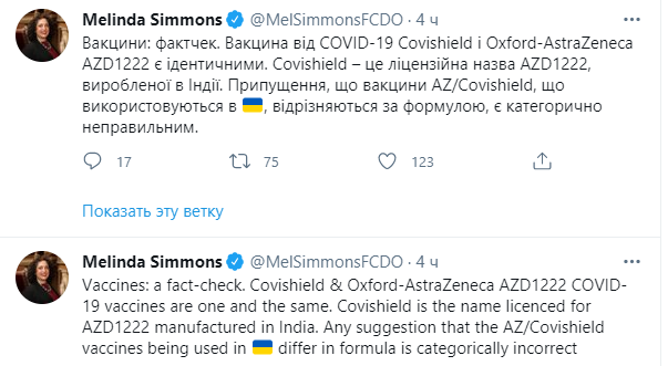"Вакцини: фактчек. Вакцина від COVID-19 Covishield і Oxford-AstraZeneca AZD1222 є ідентичними. Covishield – це ліцензійна назва AZD1222, виробленої в Індії. Припущення, що вакцини AZ/Covishield, що використовуються в Україні, відрізняються за формулою, є категорично неправильним", - пояснила Сіммонс.