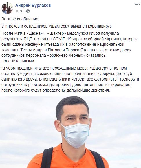 "Після матчу "Десна" - "Шахтар" медслужба клубу отримала результати ПЛР-тестів на COVID-19 гравців збірної України, які були здані напередодні їхнього від'їзду у розташування національної команди. Тести Андрія Пятова і Тараса Степаненка, а також двох співробітників персоналу "помаранчево-чорних" виявилися позитивними. Клуб вжив всіх необхідних заходів. "Шахтар" у повному складі йде на самоізоляцію за розпорядженням санітарного лікаря, який курирує клуб. У понеділок і четвер всі футболісти, тренери та співробітники першої команди пройдуть додаткове тестування, після якого будуть визначені подальші дії", -повідомляє 4 жовтня Бурлаков.