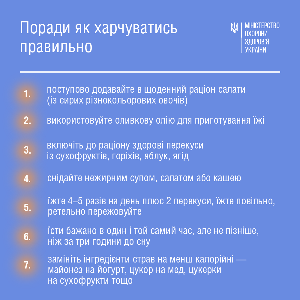 Міністерство охорони здоров'я України випустило основні рекомендації для здорового харчування. По-перше, споживати адекватну кількість калорій з достатньою кількістю білків, жирів, вуглеводів, харчових волокон, вітамінів та мінералів.