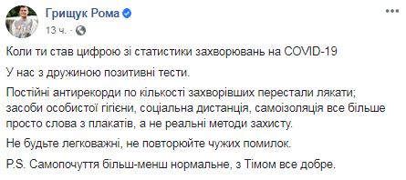 "Коли ти став цифрою з статистики захворювань на COVID-19. У нас з дружиною позитивні тести. Постійні антирекорди за кількістю хворих перестали лякати; засоби особистої гігієни, соціальна дистанція, самоізоляція все більше просто слова з плакатів, а не реальні методи захисту. Не будьте легковажні, не повторюйте чужих помилок", - закликав своїх читачів парламентар.