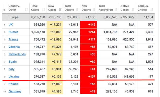 Через велику кількість хворих та померлих від коронавірусу у Європі Україна опинилась на восьмому місті серед країн. У світовому рейтингу Україна у другій десятці.