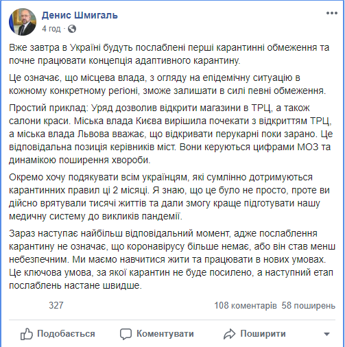 "Окремо хочу подякувати всім українцям, які дотримуються карантинних правил ці два місяці. Я знаю, це було непросто, проте ви дійсно врятували тисячі життів та дали змогу краще підготувати нашу медичну систему до викликів пандемії. Зараз настає найбільш відповідальний момент, адже послаблення карантину не означає, що коронавірусу більше немає, або він став менш небезпечним. Ми маємо навчитися жити та працювати в нових умовах. Це ключова умова, за якої карантин не буде посилено, а наступний етап послаблень настане швидше", - написав прем'єр.