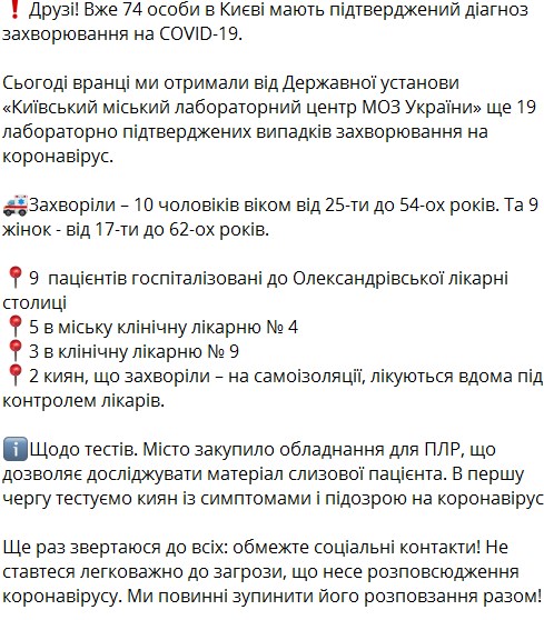 "Уже 74 людини в Києві мають підтверджений діагноз захворювання Covid-19. Сьогодні вранці ми отримали від Державної установи "Київський міський лабораторний центр МОЗ України" ще 19 лабораторно підтверджених випадків захворювання коронавірусом", - повідомив мер столиці. Кличко також розповів, що захворіли 10 чоловіків у віці від 25-ти до 54-х років. І 9 жінок - від 17-ти до 62-х років.