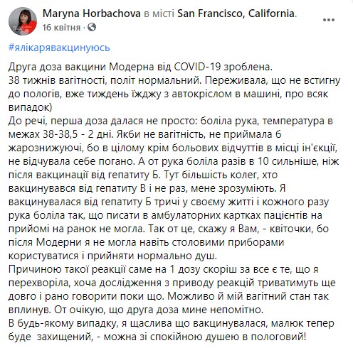 В інтернет-мережі вже з'явилися перші відгуки українців, які зробили щеплення вакциною Moderna – дехто з них вакцинувався за кордоном іще до того, як препарат потрапив в Україну. Побічні ефекти, які згадуються у соцмережах, загалом співпадають із тими, про які попереджали міжнародні фахівці – висока температура (38,5°C-40°C), яка тримається кілька днів, та біль руки після ін'єкції. Про такі реакції, зокрема, згадувалося у журналі Science.