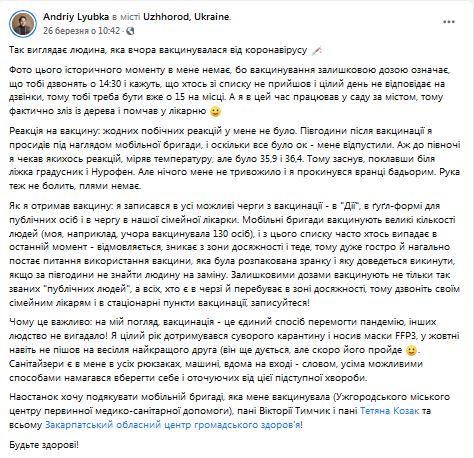 Свій досвід вакцинації описують і інші користувачі соцмереж – зокрема, киянин Ігор Дяченко вакцинувався вчора, 6 квітня. За його словами, він записався на процедуру у сімейної лікарки іще на початку лютого. Вперше на вакцинацію його запросили минулого тижня, втім, на той момент він перебував поза межами Києва. Вдруге – 5 квітня, цього разу все склалося успішно.