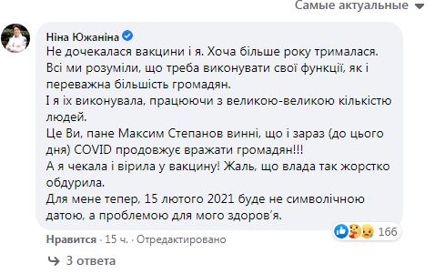 "Не дочекалася вакцини і я. Хоча понад рік трималася. Всі ми розуміли, що треба виконувати свої функції, як і переважна більшість громадян. І я їх виконувала, працюючи з великою-великою кількістю людей. Це ви, пан Максим Степанов винні, що і зараз (донині) covid продовжує вражати громадян!!! А я чекала і вірила в вакцину! Шкода, що влада так жорстко обдурила. Для мене тепер, 15 лютого 2021 року буде не символічною датою, а проблемою для мого здоров'я",- написала Южаніна.
