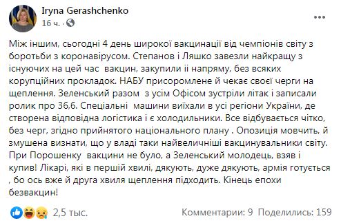 "Між іншим, сьогодні 4 день широкої вакцинації від чемпіонів світу по боротьбі з коронавірусом. Степанов і Ляшко завезли кращу з наявних на цей час вакцин, закупили її безпосередньо, без всяких корупційних прокладок", - пише Геращенко у своєму Facebook.