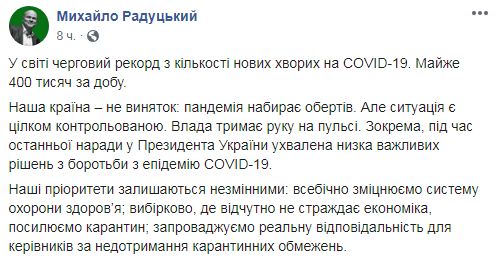 Про це заявив голова Комітету Верховної Ради з питань здоров'я нації, народний депутат від "Слуги народу" Михайло Радуцький у Facebook. Радуцький зазначив, що у світі всього за добу кількість хворих коронавірусом зросла на 400 тисяч осіб. Він повідомив, що в Україні також спостерігається суттєвий приріст нових пацієнтів, проте "влада тримає руку на пульсі".