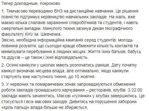 3. У червоних і помаранчевих зонах вводяться обмеження роботи закладів громадського харчування – ресторанів, клубів. У зв'язку з цим з 22: 00 заклади громадського харчування та розважальні заклади повинні бути закриті. "Дивитися на порушення заборони" крізь пальці "влада більше не збирається", - підкреслив Радуцький.