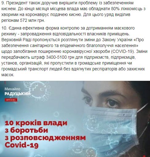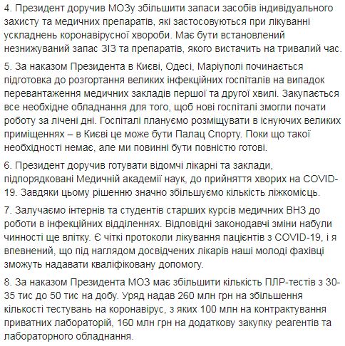 Крім того, Радуцький повідомив, що Володимир Зеленський доручив МОЗ збільшити запаси засобів індивідуального захисту та медичних препаратів, які застосовуються при лікуванні ускладнень COVID-19/ Причому запас цей повинен бути розрахований на"тривалий час".