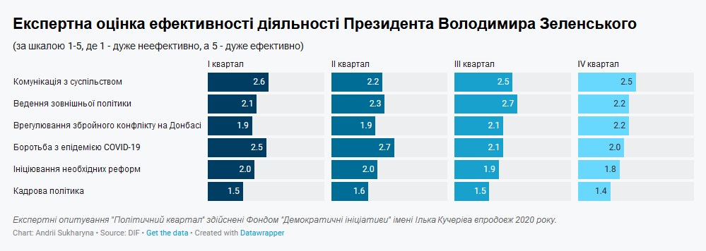 Оцінки ефективності роботи президента Володимира Зеленського, на думку експертів, надалі залишаються низькими. Так, найвищий бал отримала комунікація з суспільством (2,5 з 5 можливих). Веденню зовнішньої політики та врегулюванню конфлікту на Донбасі експерти поставили 2,2 бала. Ще нижчі оцінки виставлено боротьбі з епідемією COVID-19 (2) та ініціюванню необхідних реформ (1,8). Найбільш провальною для президента стала його кадрова політика (1,4). Річна динаміка оцінок ефективності діяльності Зеленського – переважно стабільна. Якщо порівняти з першим та другим кварталами, то відбулося суттєве зниження ефективності зусиль боротьби з епідемією, однак інші показники змінилися незначно.