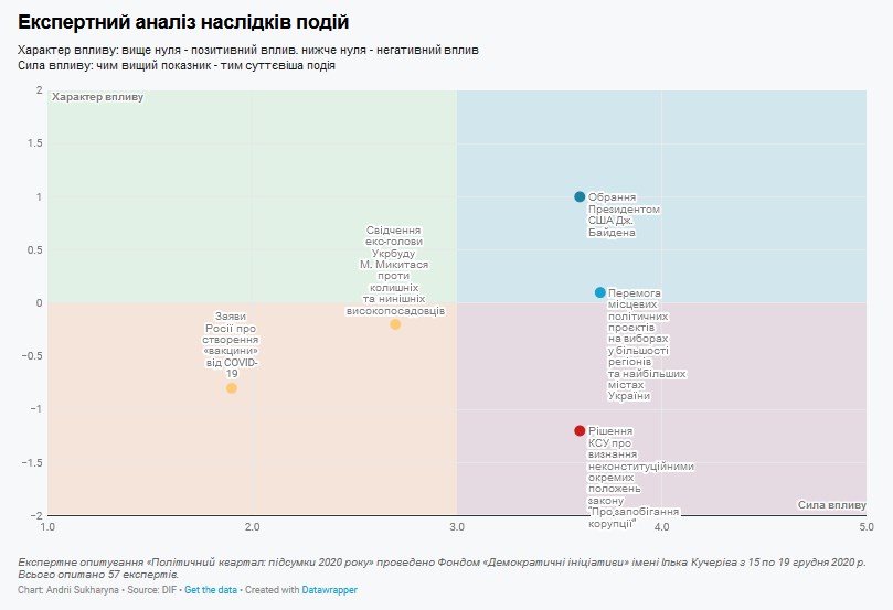 Серед пропонованих для оцінки подій, які відбулися у IV кварталі 2020 року та можуть впливати на ситуацію в Україні, експерти зазначили потужний характер впливу обрання Джо Байдена президентом США. Цей вплив, на їхню думку, має бути переважно позитивним. Зворотна ситуація з рішенням Конституційного Суду про визнання неконституційними окремих положень закону "Про запобігання корупції". Ця подія матиме суттєві негативні наслідки. Більше на українське політичне життя впливатиме тільки перемога місцевих політичних сил у більшості великих міст України. Водночас характер впливу цієї події залишається неясним.
