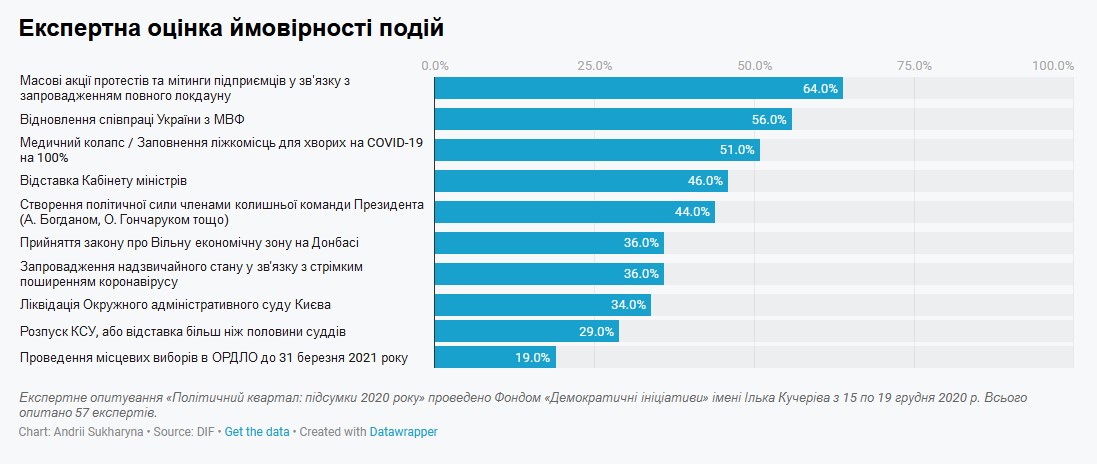 У найближчі місяці 2021 року найбільшу ймовірність (50%+) мають три події. По-перше, масові акції протестів та мітинги підприємців у зв'язку з запровадженням повного локдауну (64%). По-друге, відновлення співпраці України з МВФ (56%). По-третє, медичний колапс внаслідок заповнення ліжкомісць для хворих на COVID-19 на 100% (51%). Інші події експерти оцінили як менш ймовірні: відставка Кабміну (46%), створення нової політичної сили членами колишньої команди Президента (44%), фактично нереальним є проведення місцевих виборів в ОРДЛО до 31 березня 2021 року (19%).