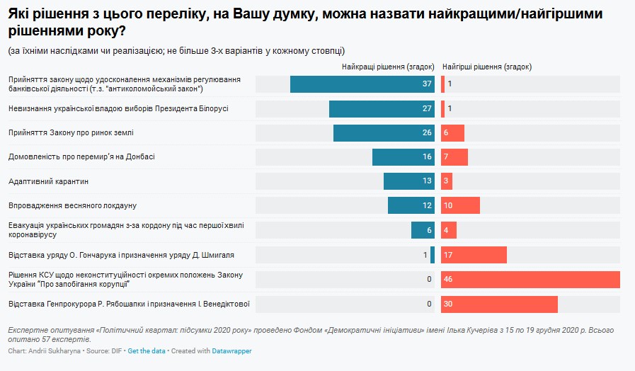 Найкращими рішеннями року з переліку запропонованих експерти обрали ухвалення т.зв. "антиколомойського" закону, невизнання українською владою результатів виборів у Білорусі та ухвалення Закону про ринок землі. Найгірші рішення з цього переліку переважно кадрові: зміна Генпрокурора з Руслана Рябошапки на Ірину Венедіктову, а також зміна уряду Олексія Гончарука на Дениса Шмигаля. Ще одним поганим рішенням є атака КСУ на антикорупційну інфраструктуру України.