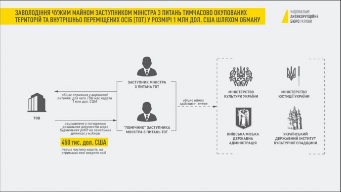 І далі цікава інтрига. Гроші призначались для забезпечення впливу на суддів Верховного суду України щодо винесення рішення на користь зацікавленої особи, а також за здійснення впливу на відповідних службових осіб Мінкульту та КМДА. Простими словами - посередництво.