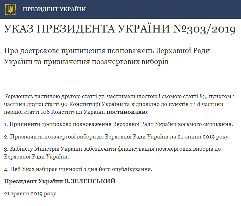 Для виконання указу про розпуск Верховної Ради президенту необхідно провести консультації з очільниками депутатських фракцій, що і було зроблено зранку 21 травня в будівлі Адміністрації Президента.