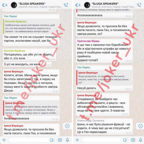 5 декабря 2019 г. случился первый конфликт внутри фракции – прямо на заседании Верховной Рады Гео Лерос подрался с нардепом от своей фракции Максимом Бужанским. Причиной драки стала переписка с оскорблениями в адрес Ирины Верещук.