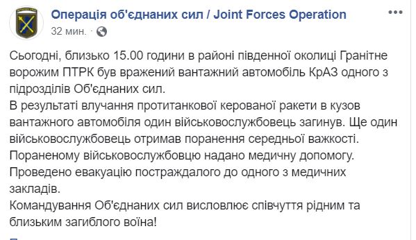 Сегодня, около 15:00 в районе южной окраины Гранитного враждебным ПТРК был поражен грузовой автомобиль КрАЗ одного из подразделений Объединенных сил.