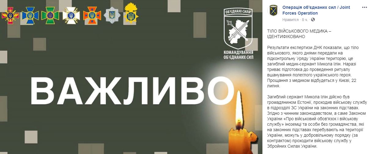"Погибший сержант Николай Илин действительно был гражданином Эстонии, проходил военную службу в подразделении ВС Украины на законных основаниях. Согласно с действующим законодательством, а именно Законом Украины "О воинской обязанности и военной службе" иностранцы и лица без гражданства, которые на законных основаниях находятся на территории Украины, могут в добровольном порядке (по контракту) проходить военную службу в Вооруженных Силах Украины", - сообщила пресс-служба штаба ООС.
