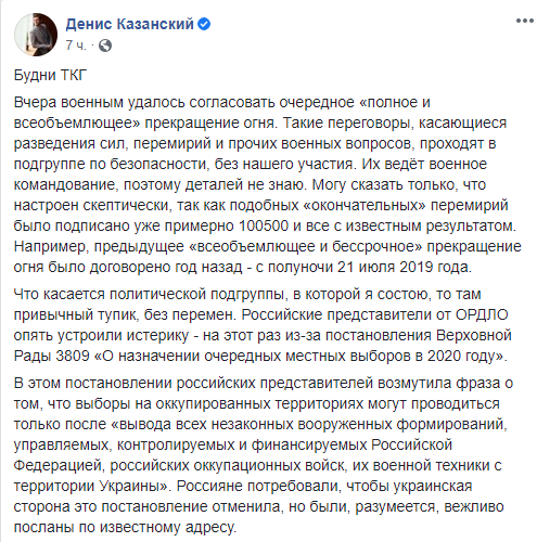 Накануне военным удалось согласовать очередное "полное и всеобъемлющее" прекращение огня, написал на своей странице в Facebook украинский журналист, участник переговоров ТКГ Денис Казанский. По его словам, такие переговоры, касающиеся разведения сил, перемирий проходят в подгруппе по безопасности, их ведет военное командование без лишнего участия. Казанский заявил, что настроен скептически, ведь подобных перемирий было множество.