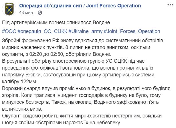 8 июля не стало исключением, поскольку оккупанты, с 2:20 до 2:50, обстреляли Водяное, сообщает штаб ООС на своей странице в Facebook.