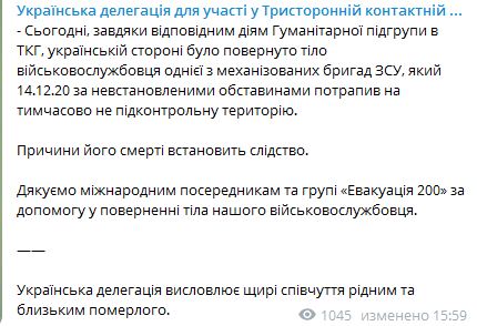 Боевики выдали тело погибшего украинского военнослужащего украинской стороне. Помощь в процессе передачи тела украинского военного оказала группа "Эвакуация 200" и международные посредники.