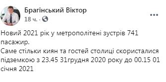 Об этом сообщил начальник коммунального предприятия "Киевский метрополитен" Виктор Брагинский в Facebook. "Новый 2021 год в метрополитене встретил 741 пассажир. Именно столько киевлян и гостей столицы воспользовались подземкой с 23:45 31 декабря 2020 года до 00:15 1 января 2021 года", - сообщил Брагинский.