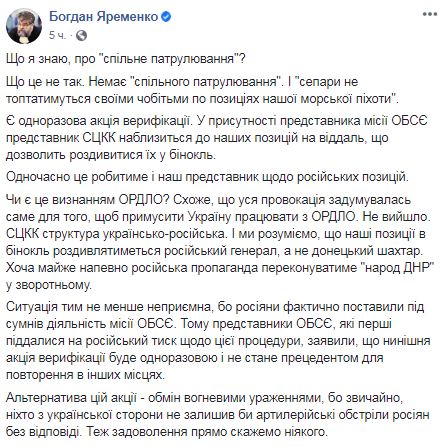 "Что я знаю, о "совместном патрулировании"? Что это не так. Нет "совместного патрулирования". И "сепары не будут топтаться своими сапогами по позициям нашей морской пехоты". Есть одноразовая акция верификации. В присутствии представителя миссии ОБСЕ представитель СЦКК приблизится к нашим позициям на расстояние, что позволит рассмотреть их в бинокль. Одновременно это будет делать и наш представитель по российским позициям. Является ли это признанием ОРДЛО? Похоже, что вся провокация задумывалась именно для того, чтобы заставить Украину работать с ОРДЛО. Не получилось", - отметил Яременко в своем сообщении.
