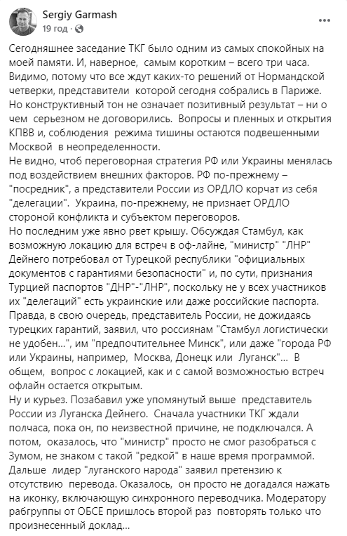 Обсуждая Турцию как возможную локацию для встреч "вживую", т.н. "глава МИД" т.н. "ЛНР" Владислав Дейнего потребовал от Анкары официальных документов с гарантиями безопасности и, по сути, признания страной паспортов "ДНР" и "ЛНР", поскольку не все участники их делегаций имеют украинские или даже российские паспорта. По словам Гармаша, Россия также заявила о нежелании встречаться в Стамбуле. Представитель России, не дожидаясь турецких гарантий, заявил, что россиянам Стамбул "логистически неудобен", им лучше Минск, или даже города РФ или Украины, например, Москва, Донецк или Луганск. То есть вопрос с локацией для возможных встреч офлайн остается открытым, отметил Гармаш. Также не обошлось и без курьезов. Вышеупомянутый представитель России из Луганска полчаса опаздывал и оказалось, что "министр" просто не смог разобраться, как подключиться к Zoom-конференции. Далее он выставил претензию по поводу отсутствия перевода, поскольку не догадался нажать на иконку, включающую синхронного переводчика. "Модератору рабочей группы от ОБСЕ пришлось вторично повторять только что сказанный доклад", – рассказал Сергей Гармаш.