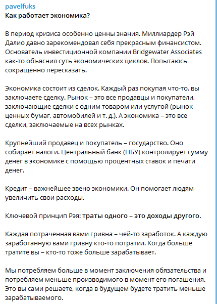 "В период кризиса особенно ценны знания. Миллиардер Рэй Далио давно зарекомендовал себя прекрасным финансистом. Попытаюсь сокращенно пересказать", - написал Павел Фукс. Ключевой принцип Рэя Далио, пишет Фукс, траты одного – это доходы другого. Каждая потраченная гривна – чей-то заработок.