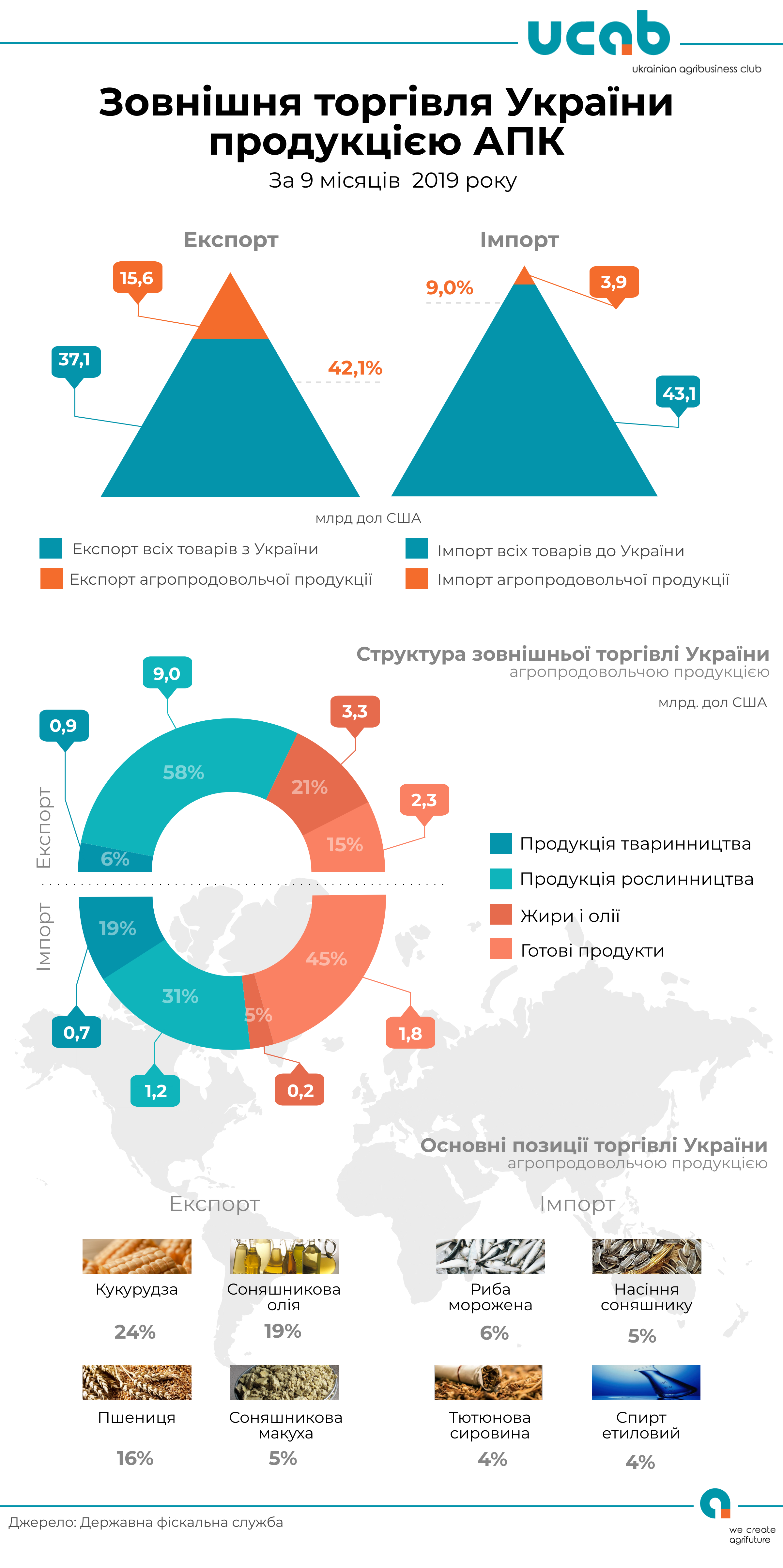 В товарной структуре экспорта больше всего выросли поставки из Украины продукции растениеводства - на 36% или 2,4 млрд долл. (за девять месяцев 2019 года по сравнению с аналогичным периодом 2018 года). Также на 12% или на 241 млн долларов вырос экспорт готовых пищевых продуктов. Больше всего по этой категории вырос экспорт жмыха подсолнечного (на 23% или 134,3 млн долл).