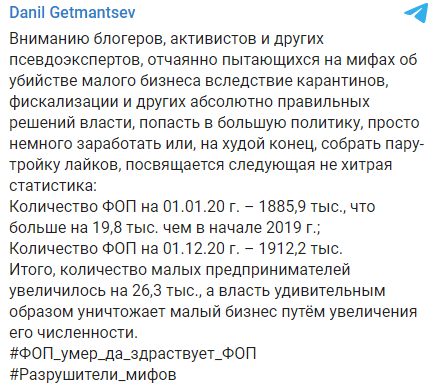 "Вниманию блогеров, активистов и других псевдоэкспертов, которые отчаянно пытаются на мифах об убийстве малого бизнеса вследствие карантинов, фискализации и других абсолютно правильных решений власти, попасть в большую политику, просто немного заработать или, на худой конец, собрать пару-тройку лайков, посвящается следующая не хитрая статистика ", - прокомментировал Гетманцев обнародованные им данные.