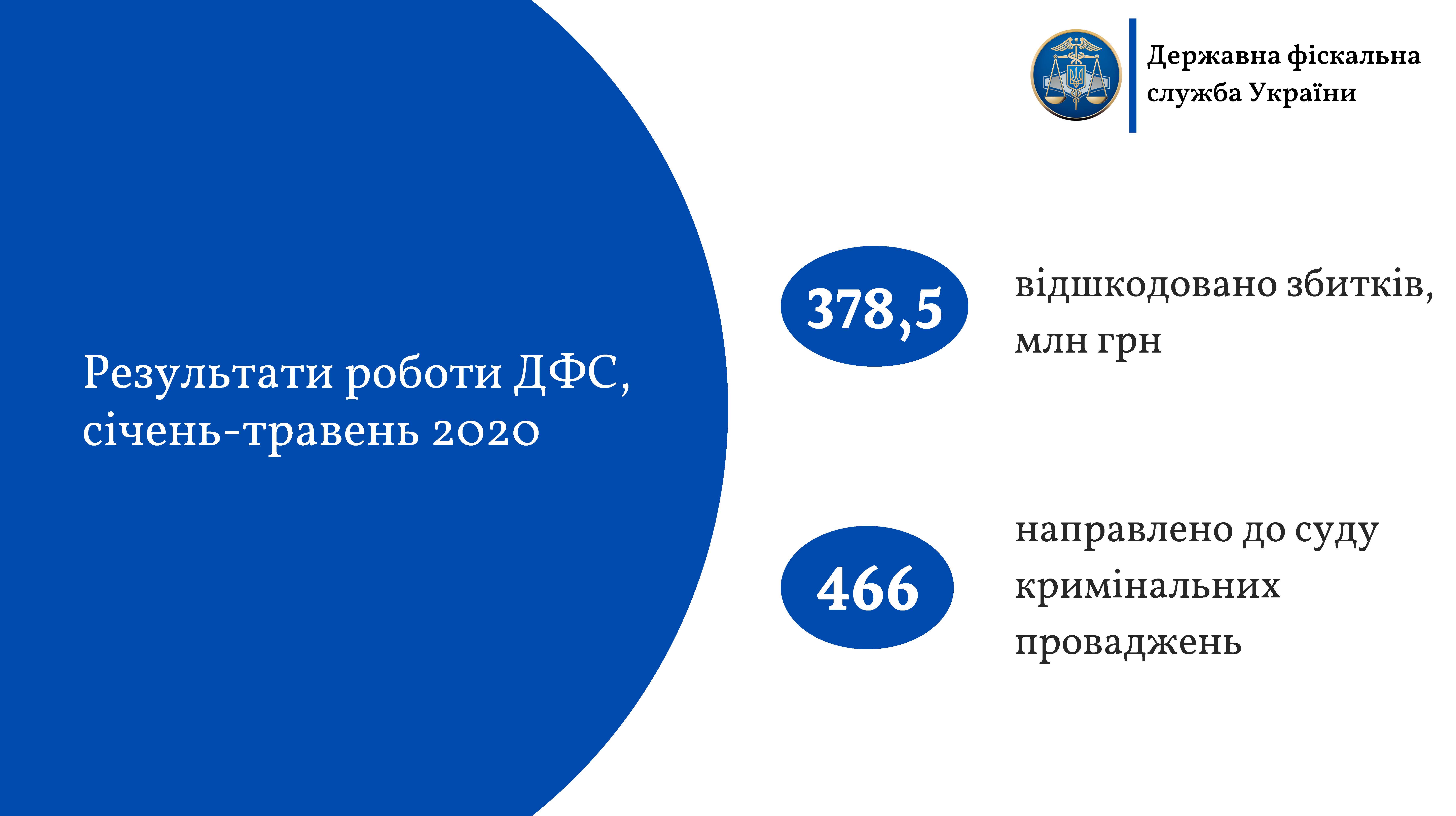 Государственная фискальная служба Украины в январе-мае 2020 года в направленных в суд 466 уголовных производствах обеспечила возмещение 378,5 млн гривен. По сравнению с аналогичным периодом прошлого года, количество уголовных производств, направленных в суд, уменьшилось на 28%. Это произошло из-за карантина и пандемии COVID-19.