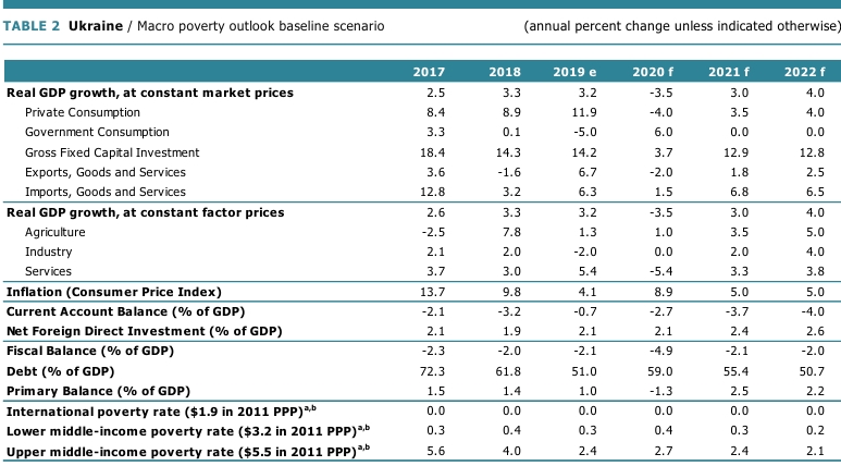 Аналитики Всемирного банка прогнозируют, что инфляция в Украине в 2020 году вырастет до 8,9%, а реальные доходы упадут на 4%, тогда как дефицит госбюджета возрастет до 4,9% от ВВП, а уровень госдолга вырастет до 59% от ВВП .
