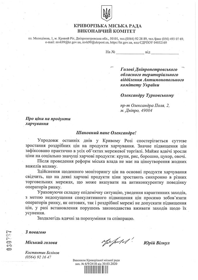 В обращении к председателю Днепропетровского областного территориального отделения АМКУ мэр указывает на то, что в Кривом Роге наблюдается существенный рост розничных цен на продукты питания.