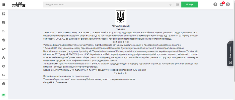 Кроме того, согласно решению Киевского апелляционного административного суда от 12 октября 2016 года на Солодченко распространяется действие закона Украины "Об очистке власти", то есть люстрация. Впрочем, Солодченко подал кассационную жалобу на это решение. Согласно данным Реестра судебных решений, доступных в информационно-аналитической системе YouControl, кассационная жалоба была передана Высшим административным судом Украины в Верховный суд 12 января 2018 года. То есть почти через полтора года после принятия решения Киевского апелляционного административного суда о его люстрации.