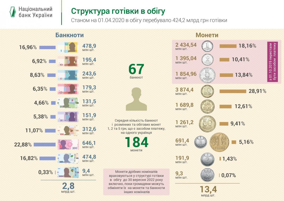 На одного гражданина Украины по состоянию на 1 апреля 2020 года приходится 67 банкнот и 184 монеты. Об этом сообщил во вторник, 14 апреля, Национальный банк Украины на своей Facebook-странице.