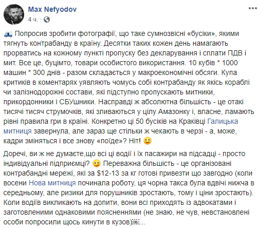 "Десятки таких каждый день пытаются прорваться на каждом пункте пропуска без декларирования и уплаты НДС и пошлин. Все это, якобы, товары личного использования. 10 кубов * 1000 машин * 300 дней - вместе складывается в макроэкономические объемы. Куча критиков в комментариях представляют почему-то себе контрабанду как какие-то корабли или железнодорожные составы, которые коварно пропускают таможенники, пограничники и СБУшники. На самом деле абсолютное большинство - это вот такие тысячи тысяч ручейков, которые сливаются в целую Амазонку и, собственно, ломают равные правила игры в стране. Конкретно эти 50 бусиков на Краковце Галицкая таможня завернула, но сейчас еще столько же ждут в очереди - а, может, кадры изменятся и все снова "поедет"? Нет", - написал Нефедов.