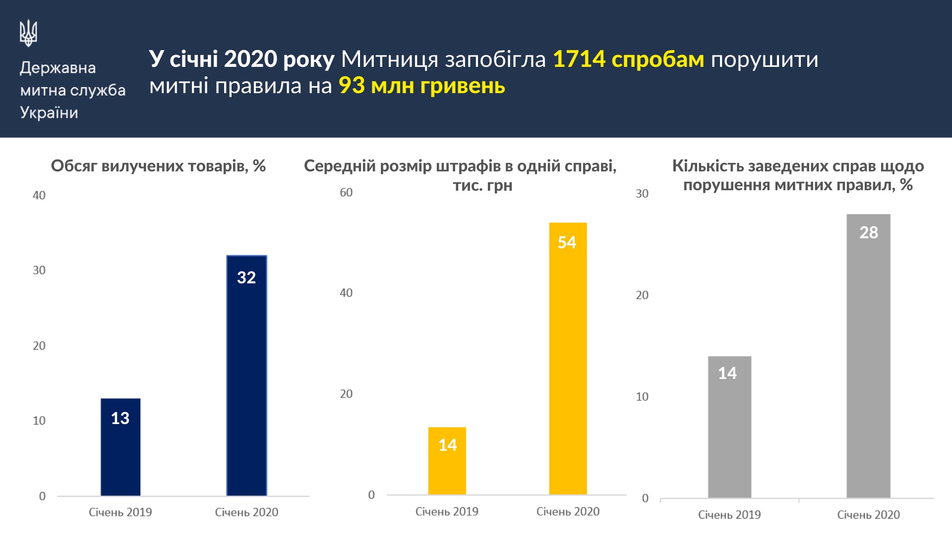 На странице Новой таможни в Facebook сообщается, что стало в 2,5 раза больше дел с реально изъятыми товарами (если сравнивать январь 2020 с январем 2019); почти в 4 раза вырос средний размер штрафов по одному делу; в 2 раза больше открытых дел с незаконным перемещением товаров, а также уклонением от уплаты таможенных платежей (аналогичный период).