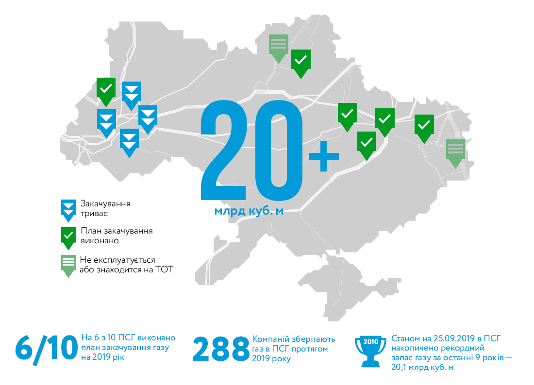 "В связи с достижением расчетных объемов прекращены закачки голубого топлива на 6 (из десяти) ПХГ. Сейчас природный газ закачивается в Бильче-Волицкое, Угерское, Дашавское и Богородчанское ПХГ в режиме 65 млн кубометров в сутки. На сегодня запас газа в украинские ПХГ составляет рекордные 20,1 млрд кубометров газа, что является наибольшим показателем на эту дату с 2010 года", - сообщили в компании.