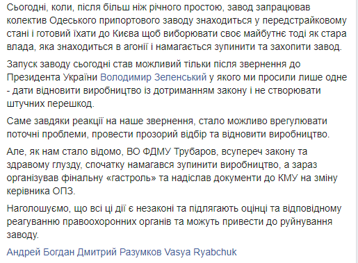В опубликованном письме к президенту Зеленскому отмечается, что коллективу ОПЗ стали известны факты сговора в Кабмине, чтобы рейдерским путем через Фонд государственного имущества сменить руководство завода для дальнейшего саботирования работы предприятия.