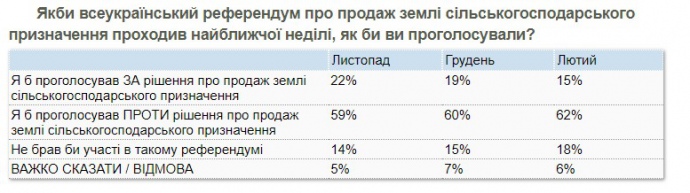 "Если бы всеукраинский референдум о продаже земли сельскохозяйственного назначения происходил в ближайшее воскресенье, 15% украинцев проголосовали бы на референдуме "за" рынок земли, 62% - "против", еще 18% не принимали бы участия в голосовании. В течение периода ноябрь 2019 года - февраль 2020 года, доля сторонников продажи земли снижалась: 22% в ноябре, 19% - в декабре, 15% - в феврале", - говорится в исследовании.