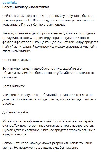Известный бизнесмен и меценат Павел Фукс в своем Телеграмм-канале поделился интересным мнением колумниста Bloomberg Питера Коя о ситуации с мировой экономикой во время пандемии коронавируса.
