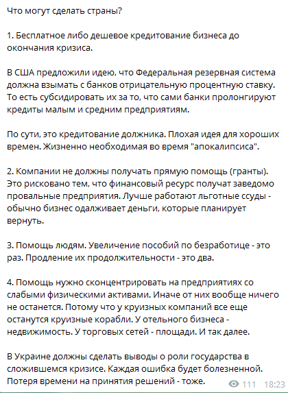 "Что могут сделать страны? Бесплатное либо дешевое кредитование бизнеса до окончания кризиса. Компании не должны получать прямую помощь (гранты). Помощь людям. Увеличение пособий по безработице - это раз. Продление их продолжительности - это два. Помощь нужно сконцентрировать на предприятиях со слабыми физическими активами. Иначе от них вообще ничего не останется. В Украине должны сделать выводы о роли государства в сложившемся кризисе. Каждая ошибка будет болезненной. Потеря времени на принятия решений – тоже", - резюмировал Фукс.