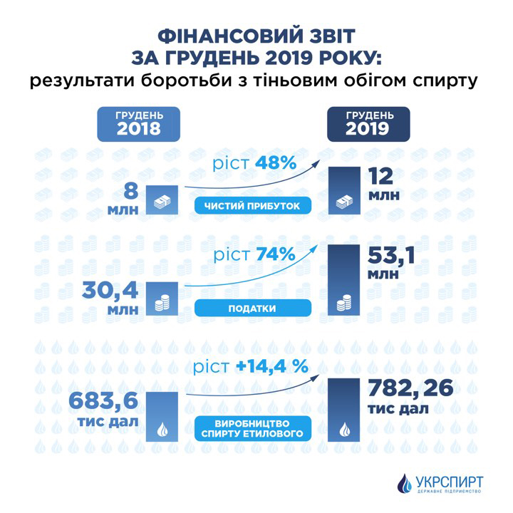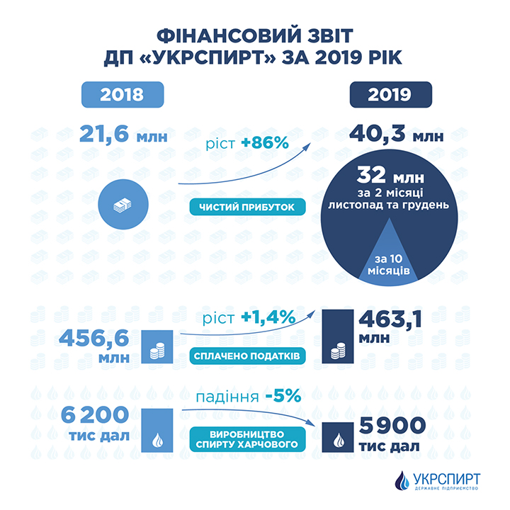 Чистая прибыль ГП "Укрспирт" в 2019 году выросла на 86% и составила 40,3 млн грн против 21,6 млн грн в 2018 году.