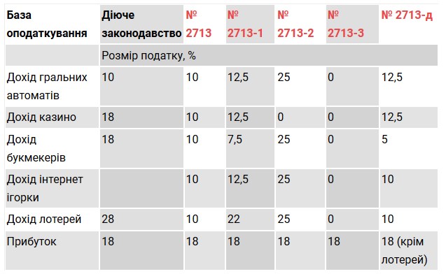 - Авторы альтернативных законопроектов предлагают другие варианты ставок. "Слуга народа" Наталуха (2713-1) предлагает незначительно поднять действующий налог для игровых автоматов и уменьшить всем остальным.