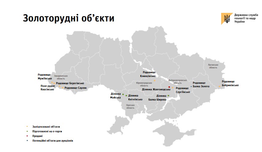 Украина владеет около 3 тысячами тонн золоторудного потенциала. Для Европы это неплохой показатель. Учтено семь месторождений, на пять из них выданы специальные разрешения, добыча осуществляется пока только в Мужиево (Закарпатье). Все подготовленные к электронным торгам объекты предлагаются для геологического изучения и опытно-промышленной разработки.