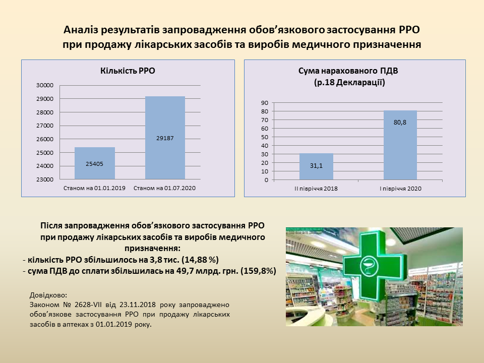 В ГНС сообщили, что с 1 января 2019года по 1 июля 2020 года дополнительно зарегистрировано 3,8 тысячи регистраторов расчетных операций для использования при проведении расчетов в аптеках. Если сравнивать налоговые обязательства по аптекам во II полугодии 2018 года (до введения РРО) и I полугодии 2020 года, то наблюдается существенное увеличение суммы самостоятельно определенного к уплате НДС на 49,7 миллиарда гривен, или на 159,8%.