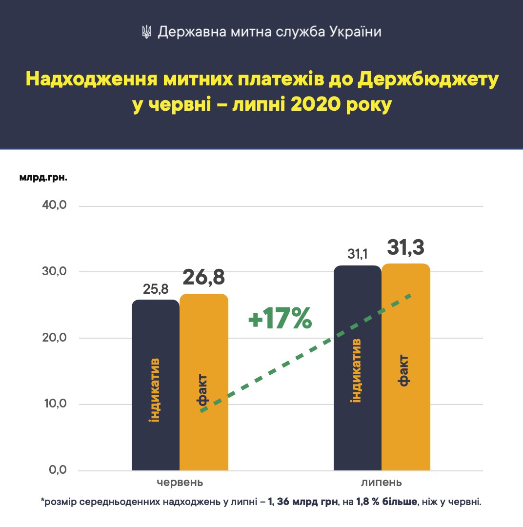 Во втором летнем месяце Государственная таможенная служба Украины смогла выполнить поставленные задачи Министерством финансов о плане перечисления в госбюджет определенной суммы доходов. Согласно сообщению Гостаможни, в июле 2020 года бюджет благодаря работе ведомства был пополнен на 17% больше, чем в предыдущем месяце.