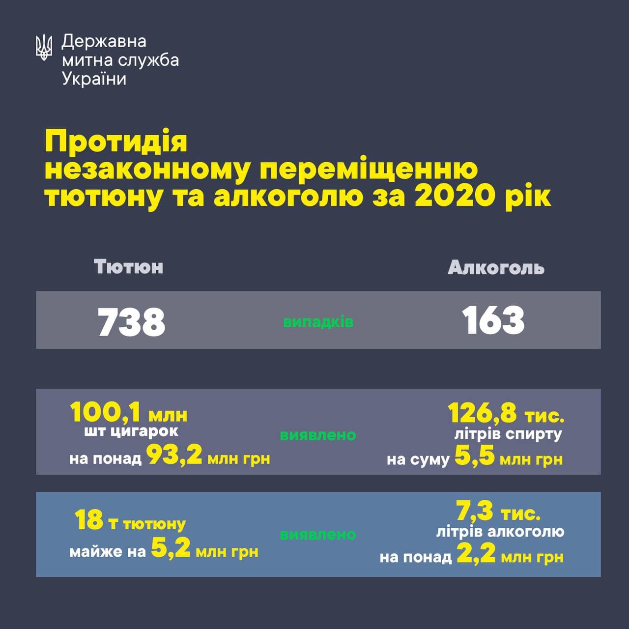 За прошлый год работники таможни обнаружили 738 случаев контрабанды табака и табачных изделий. Всего изъято более 100,1 миллиона штук сигарет на общую сумму более 93,2 миллиона гривен и более 18 тонн табака на общую сумму почти 5,2 миллиона гривен.